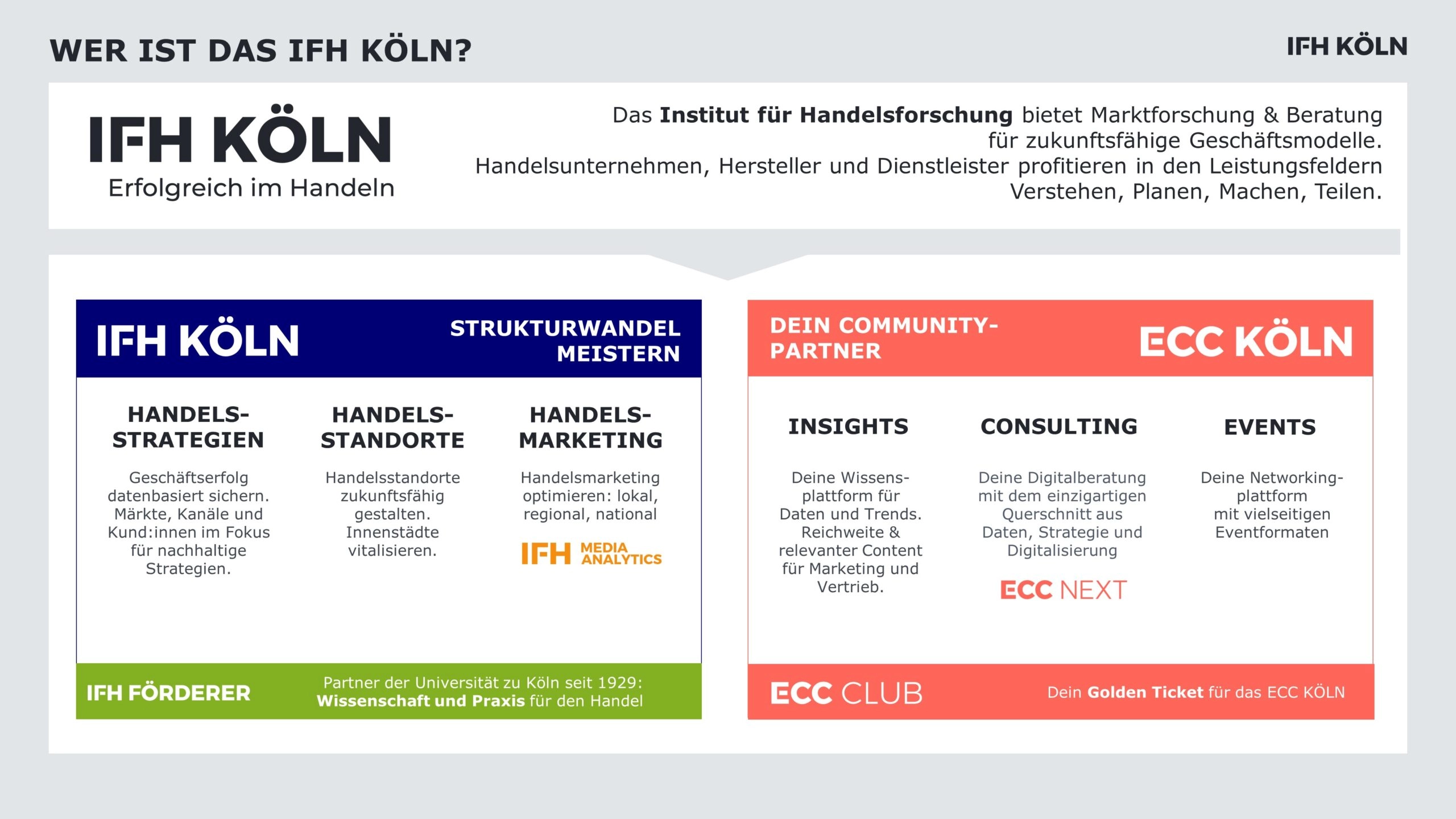 Unsere Branchenkompetenz und Praxisnähe, unsere große eigene Community aus ECC CLUB und den IFH FÖRDERERN und unsere wissenschaftlichen Wurzeln an der Universität zu Köln als auch 90 Jahre Geschichte verpflichten uns zu wertigem Wissenstransfer, empirisch fundierter Beratung und zu einem modernen Dienstleistungsverständnis.